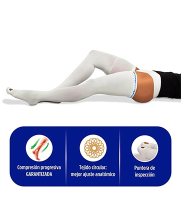 Su tejido circular con fibras de doble recubrimiento garantiza la compresión progresiva, elasticidad y durabilidad.